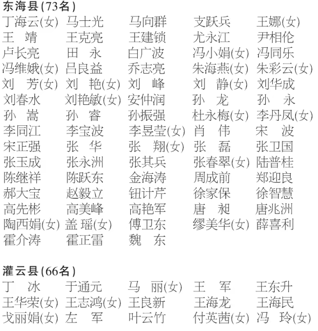 連云港市十五屆人民代表大會代表名額為419名,各縣區和解放軍駐連部隊依照選舉法和省選舉實施細則的規定,實際選出419名。連云港市第十四屆人大常委會第四十四次會議根據代表資格審查委員會提出的代表資格審查報告,確認選舉產生的419名代表的代表資格全部有效,現將名單予以公告(以姓氏筆畫為序):