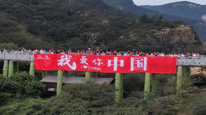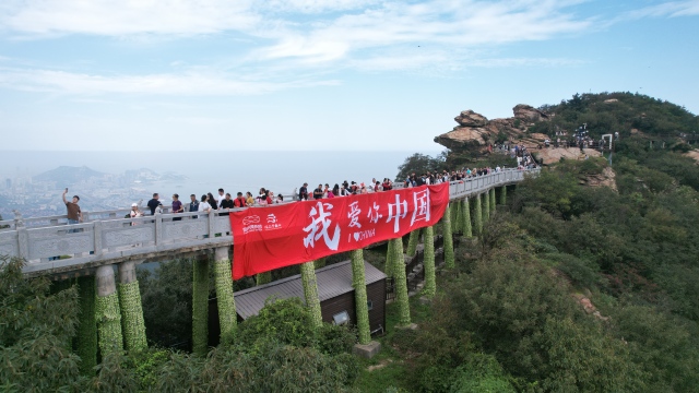 10月1日上午,市民游客來到海上云臺山景區(qū),在云頂手持紅旗合唱,向偉大祖國表白。